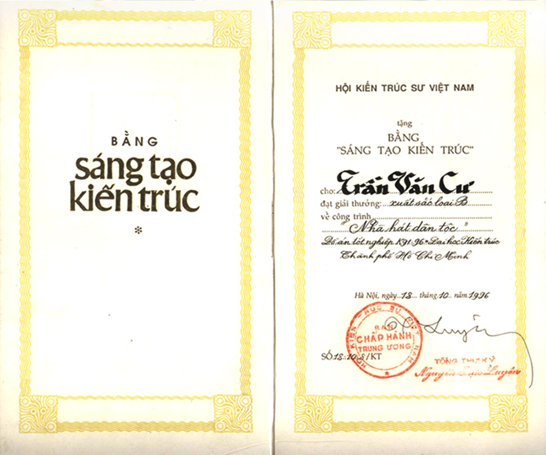 Ngày 18/10/1996, Kiến trúc sư Trần Văn Cư nhận Bằng khen sáng tạo kiến trúc của Hội Kiến trúc sư Việt Nam cho đồ án tốt nghiệp về công trình Nhà hát dân tộc.