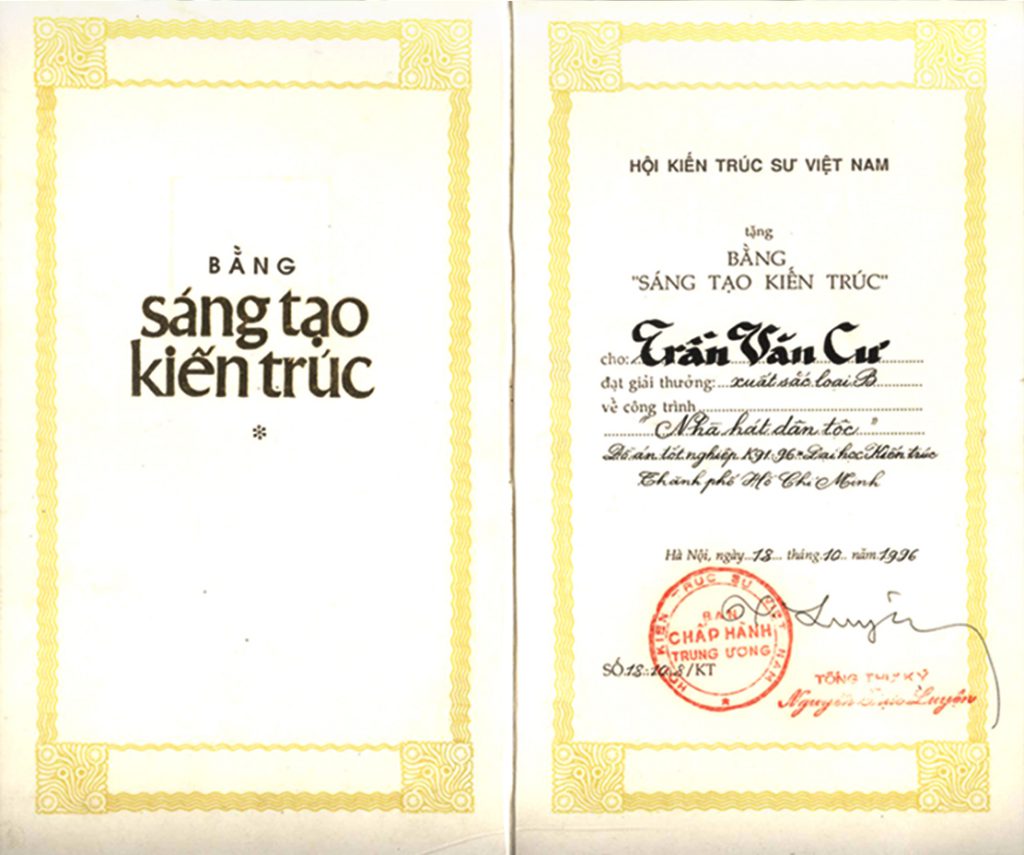 Ngày 18/10/1996, Kiến trúc sư Trần Văn Cư nhận Bằng khen sáng tạo kiến trúc của Hội Kiến trúc sư Việt Nam cho đồ án tốt nghiệp về công trình Nhà hát dân tộc.